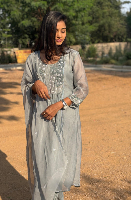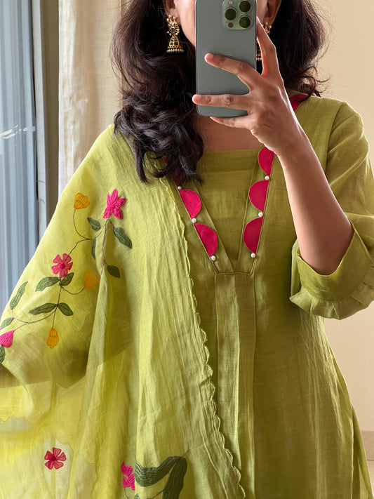 A0190 Mul chanderi 3 piece set with hand embroidery and beads detailing