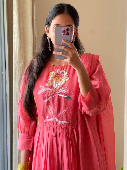 A0421 peach mul chanderi 3 piece dress with hand embroidery, beads and chips work