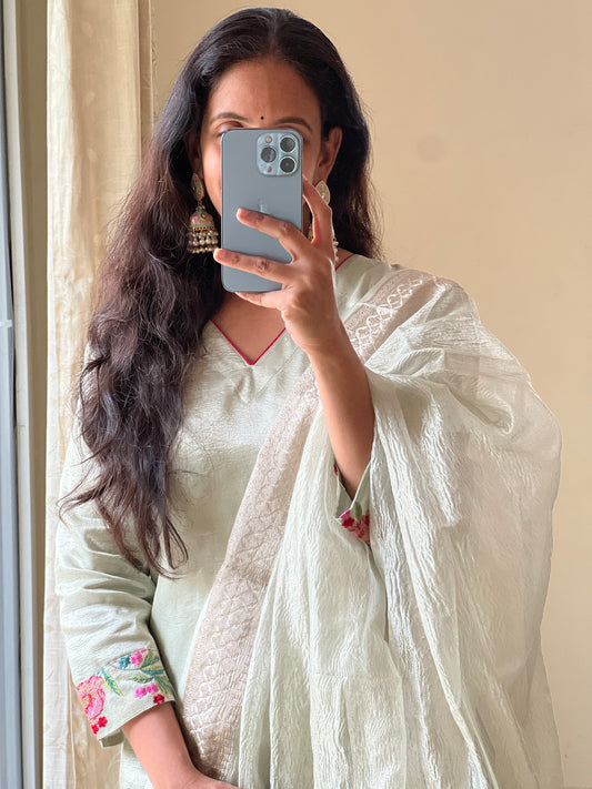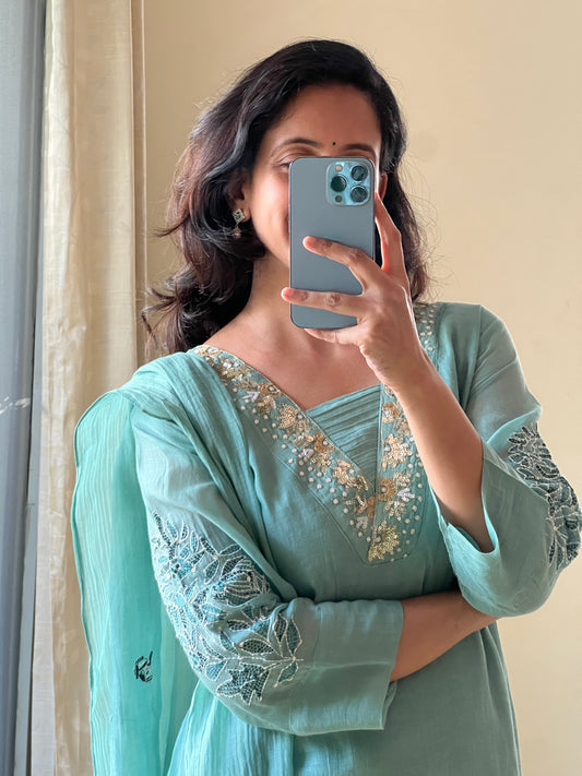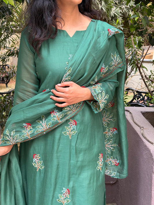 A0449 green Mul chanderi 3 piece dress with Kantha & chikankari work detailing all over the dress