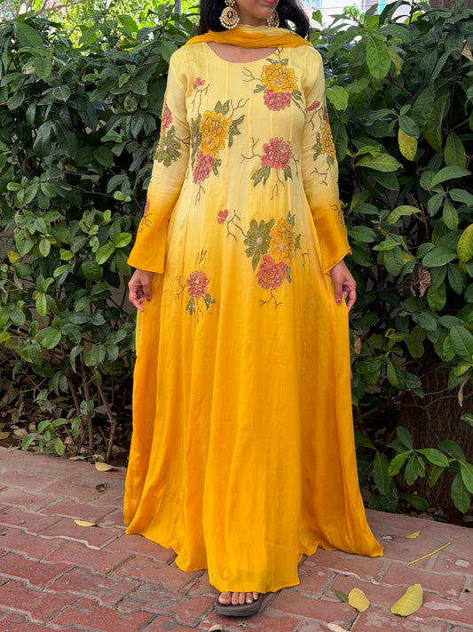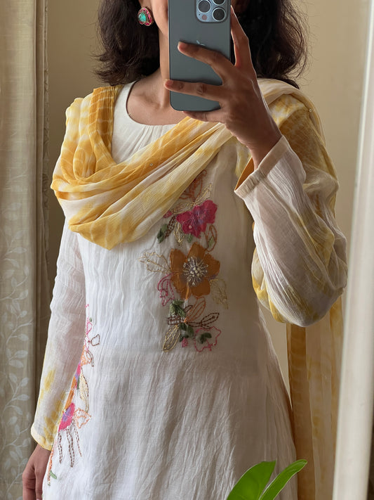 A0502 white & yellow tie dye mul chanderi 3 piece dress with hand paint & embroidery detailing comes with chiffon tie dye duppatta. The best part of this dress is at back part also you have same floral bunch detailing with hand paint & embroidery