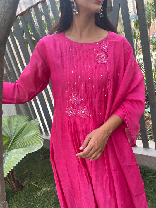 A0327 Mul chanderi 3 piece in pink shade with applique and pearl detailing