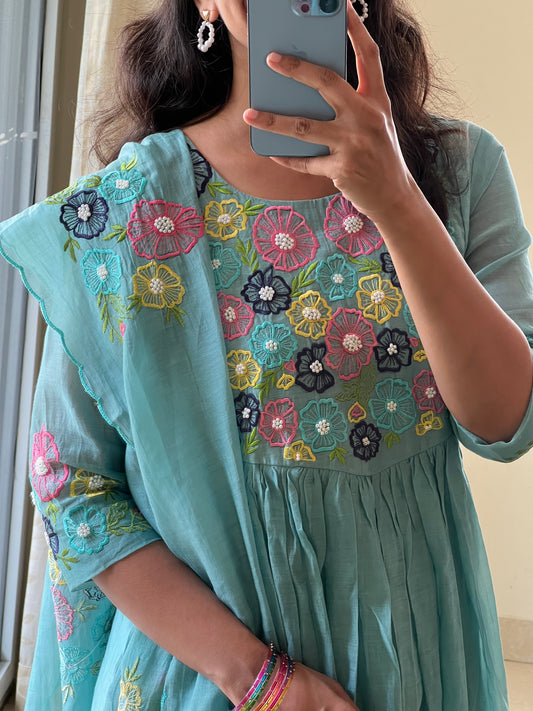 A0521 firozi blue mul chanderi 3 piece dress with multi colour threads floral embroidery all over the yoke & duppatta