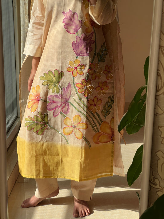 A0550 tussar 3 piece dress with hand painted, Kantha work & knit work detailing