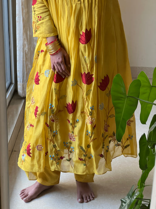 A0633 yellow Mul cahnderi 3 piece dress with applique, Kantha & hand embroidery detailing all over the duppatta & dress