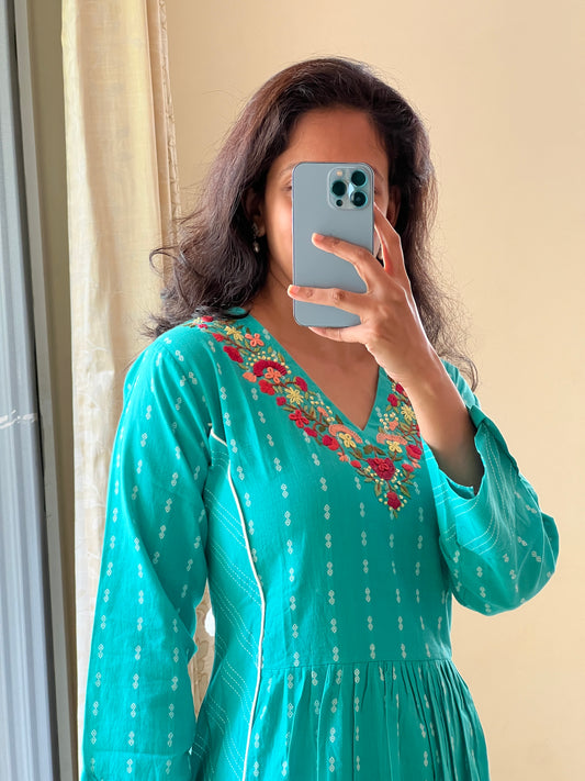 1107 green Handloom cotton weave one piece dress with hand embroidery