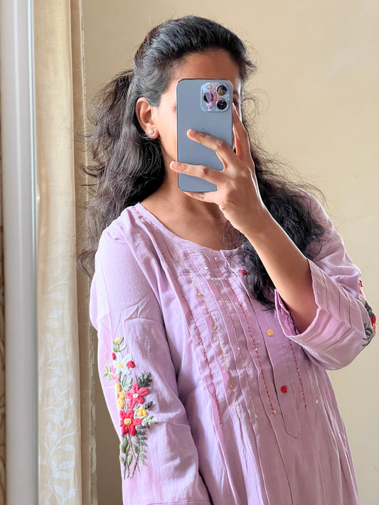 #9149 Mulmul lavender two piece dress with pleats and hand embroidery on hands