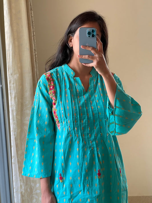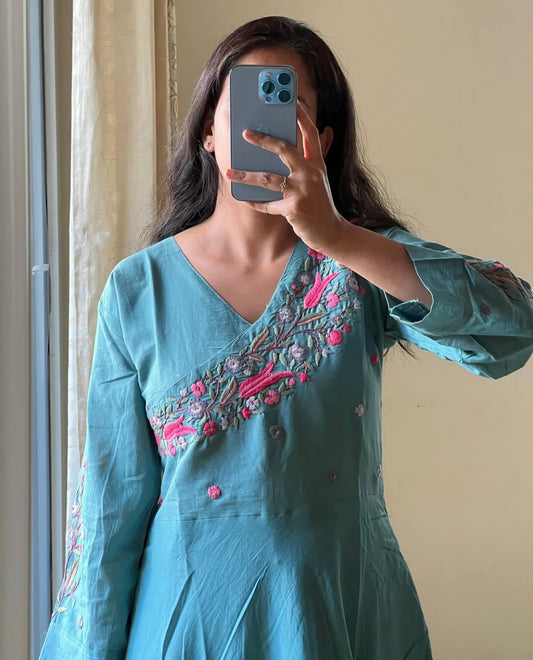 9046 blue handloom cotton Straight cut Hand Embroidery