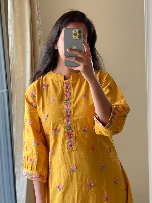 9086 mustard yellow handloom cotton a line one piece dress