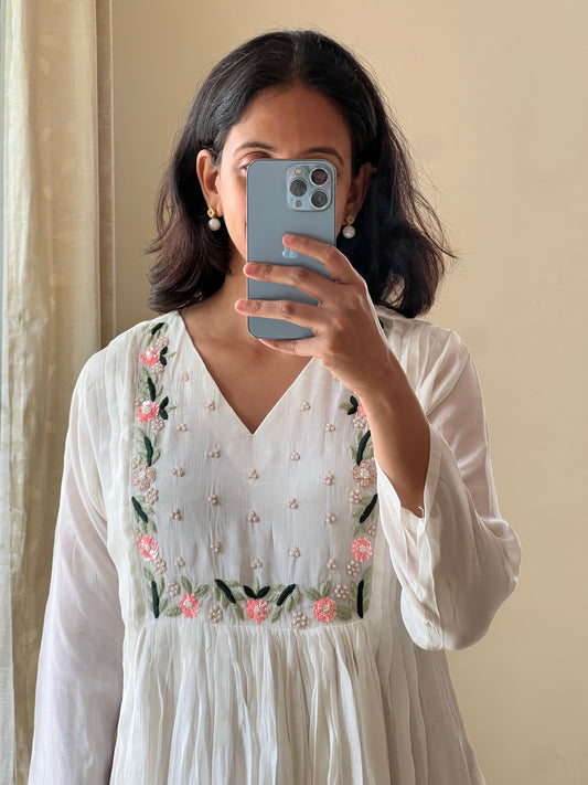 A0450 white chinnon one piece dress with hand embroidery detailing on yoke part