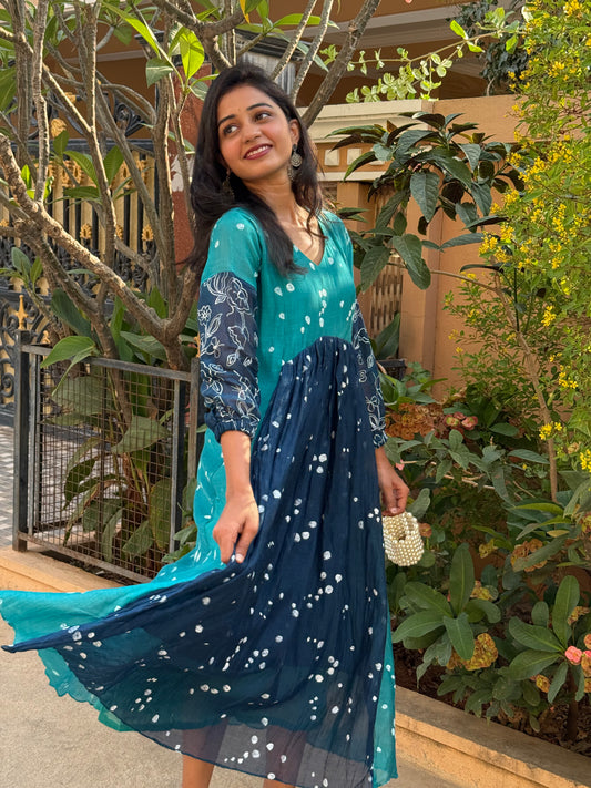 A0444 This stunning block-printed dress is crafted from a luxurious blend of premium MulChanderi fabric. Experience the ultimate in eco-friendly fashion and artistic detail of Block print.