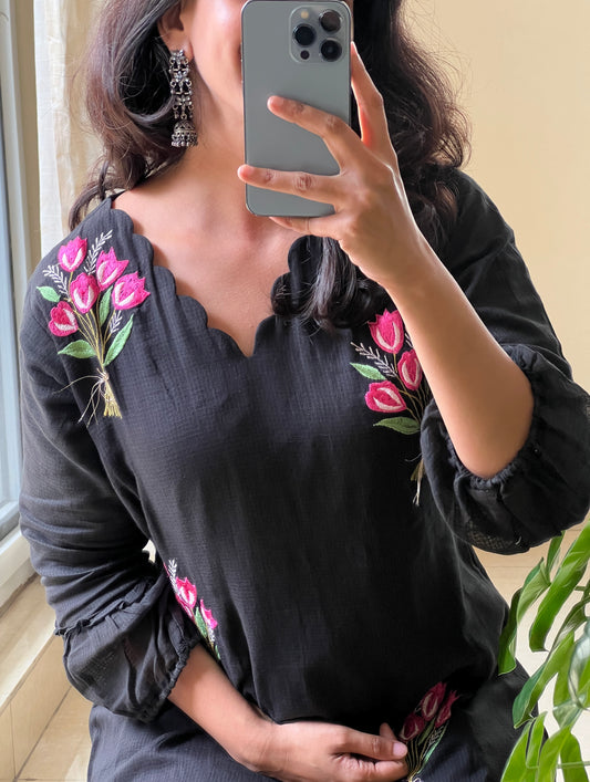 A0517 black cotton kota one piece dress with flower bunch embroidery all over the dress