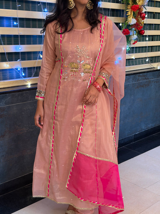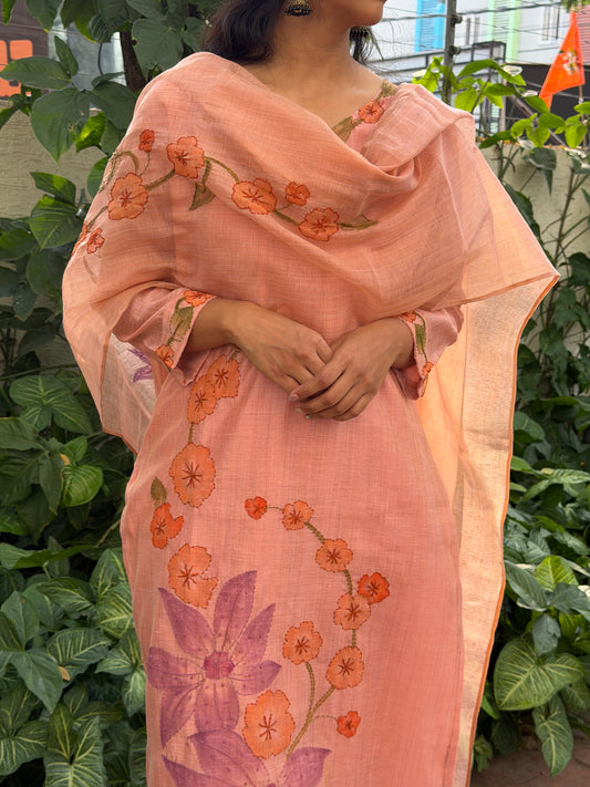 A0639 Matka MulChanderi 3pc set in peach shade with hand paint and hand work detailing