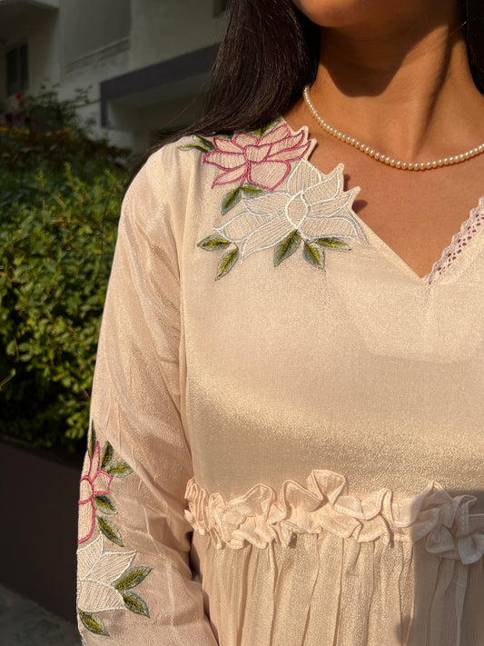 A0367 half white or cream chinnon one piece dress with hand embroidery detailing