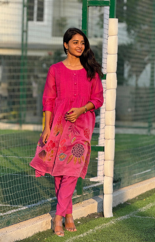 Pink shaded hand painted Mal-chanderi Co-ord set