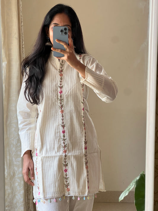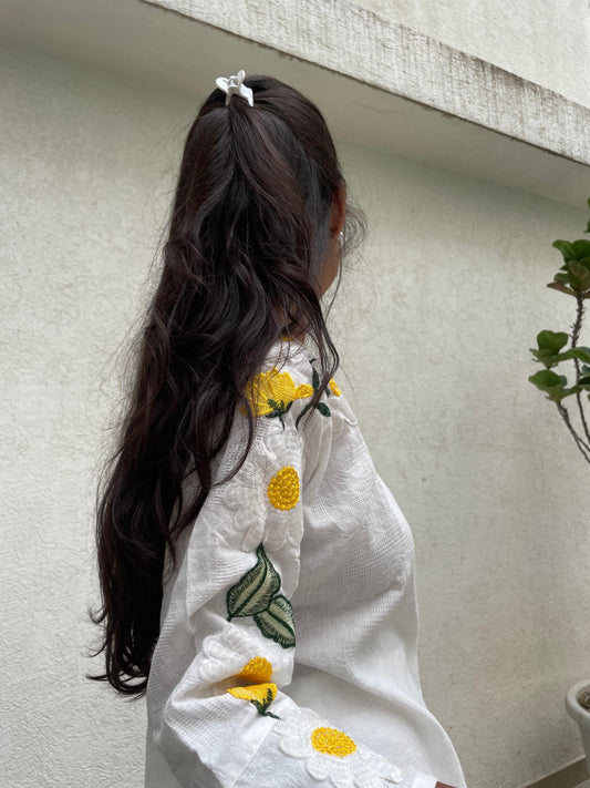 A1525 white premium cotton self weaved coord set with yellow floral hand embroidery