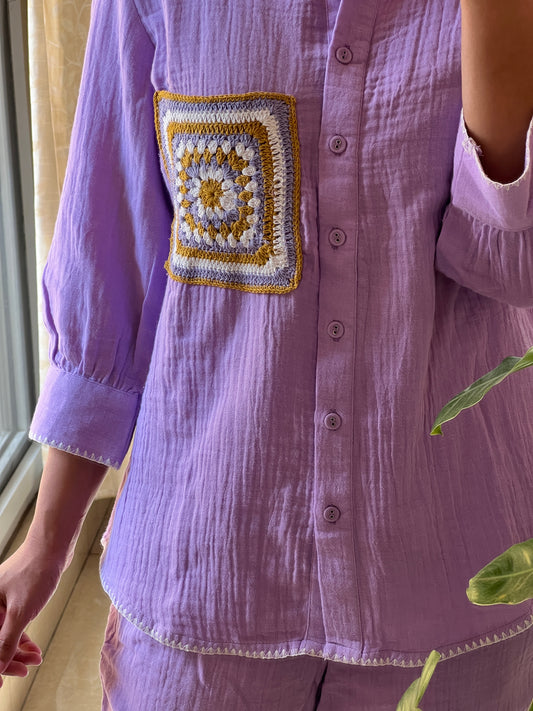 A0315 lavender crushed cotton coord set with crochet lace patch work detailing