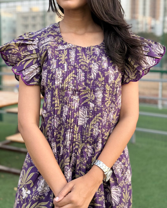 A0377 purple pure cotton hand block print coord set with pleats & cut work machine embroidery detailing