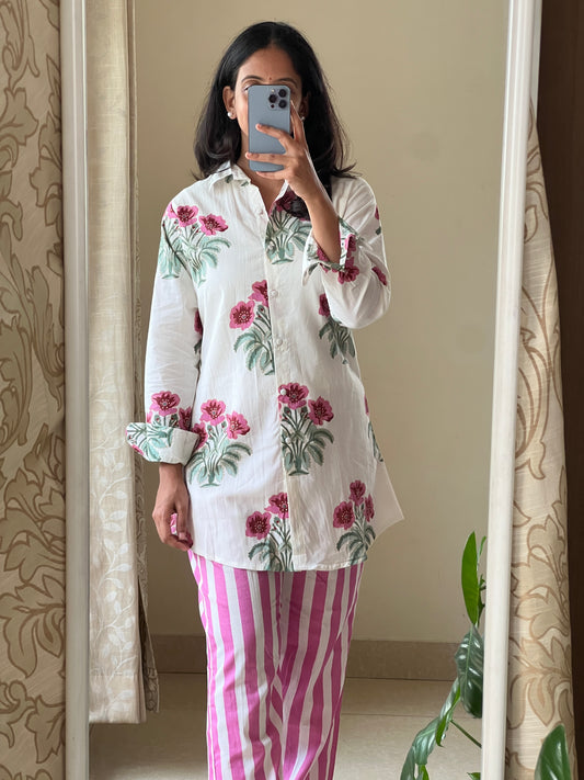 A0476 white & pink pure cotton hand block printed coord set