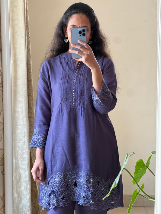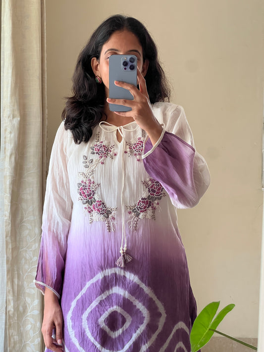 A0500 white & purple tie dye mul chanderi coord set with hand embroidery detailing on yoke part