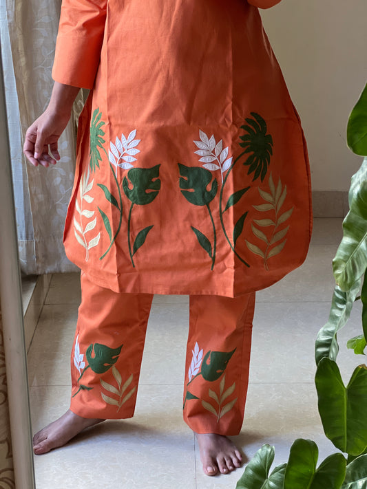 A0300 orange handloom cotton leaf applique work co ord set
