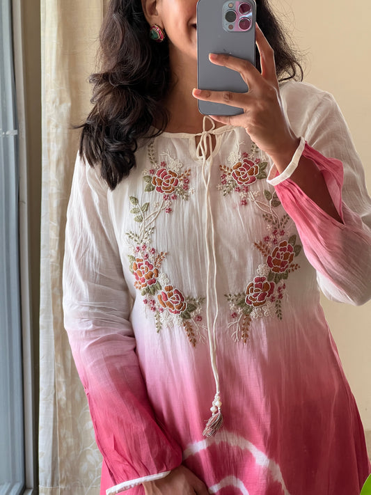 A0501 white & peach tie dye mul chanderi coord set with hand embroidery detailing on yoke part