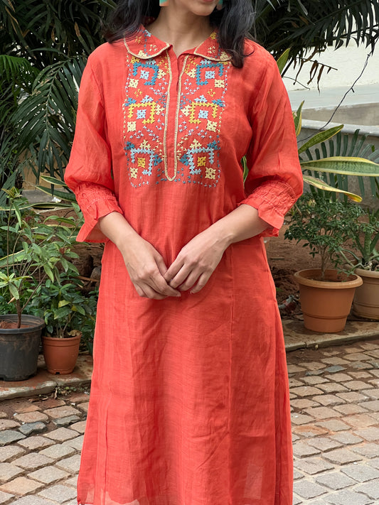 A0612 rust mul chanderi coord set with Kutch work embroidery