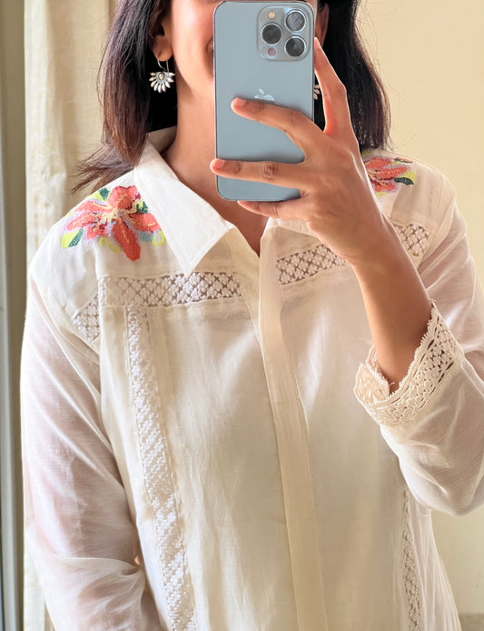 A0516 white mul chanderi coord set with cross stich embroidery on shoulder part & pants