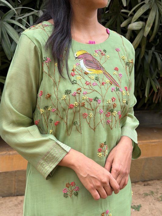 A0601 Green mul chanderi coord set with bird hand painted & hand embroidery detailing all over the dress