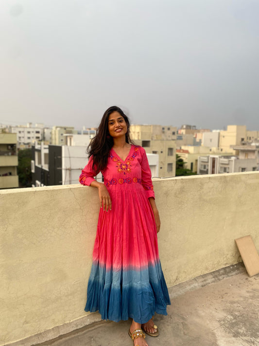 A0383 pink & blue Mulmul crushed shaded one piece dress with mirror embroidery detailing & 6 meters ghera