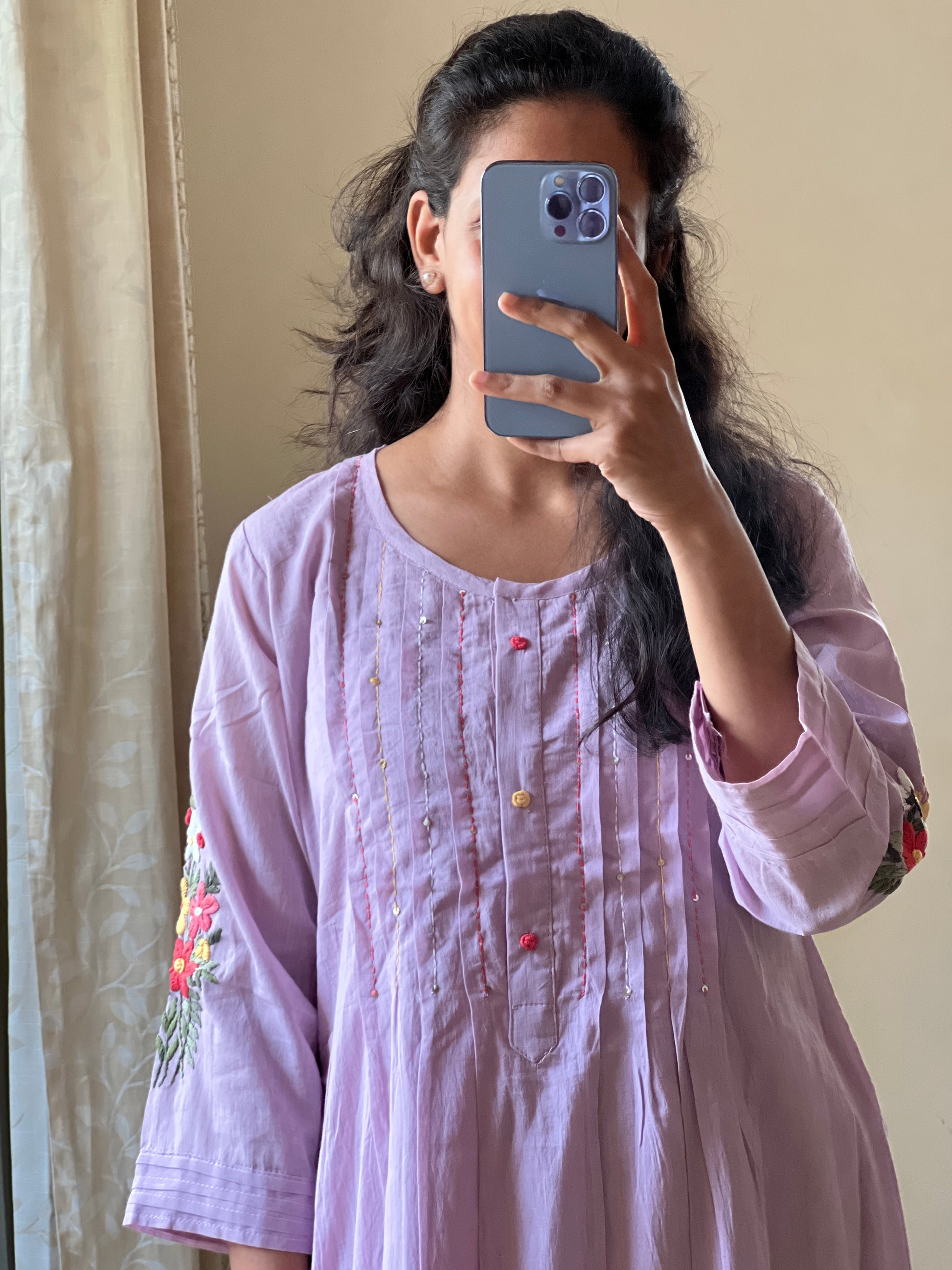 #9149 Mulmul lavender two piece dress with pleats and hand embroidery on hands