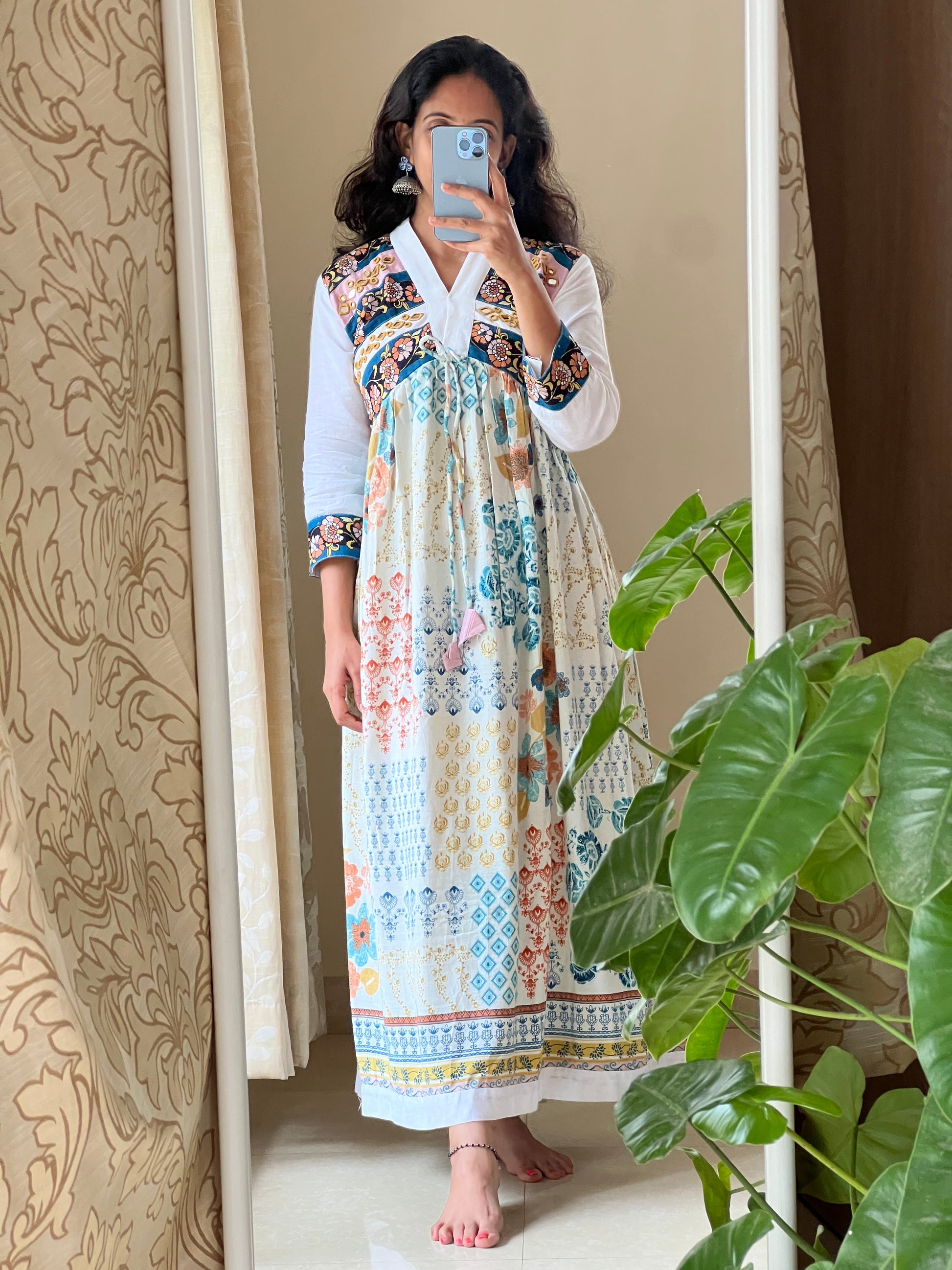 A010 white Imported Cotton falling fabric with original mirror hand embroidery work on yoke part one piece dress