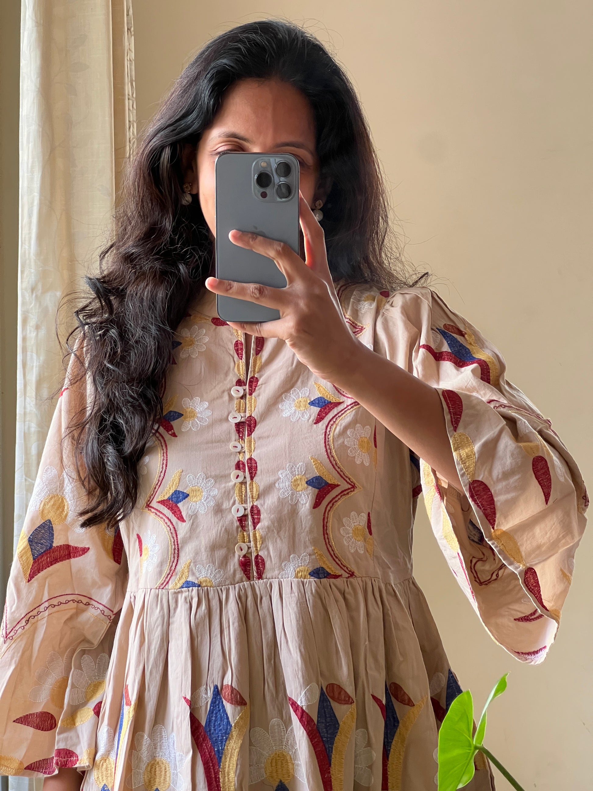 A0135 Cream Pure Cotton Short frock with Machine Embroidery