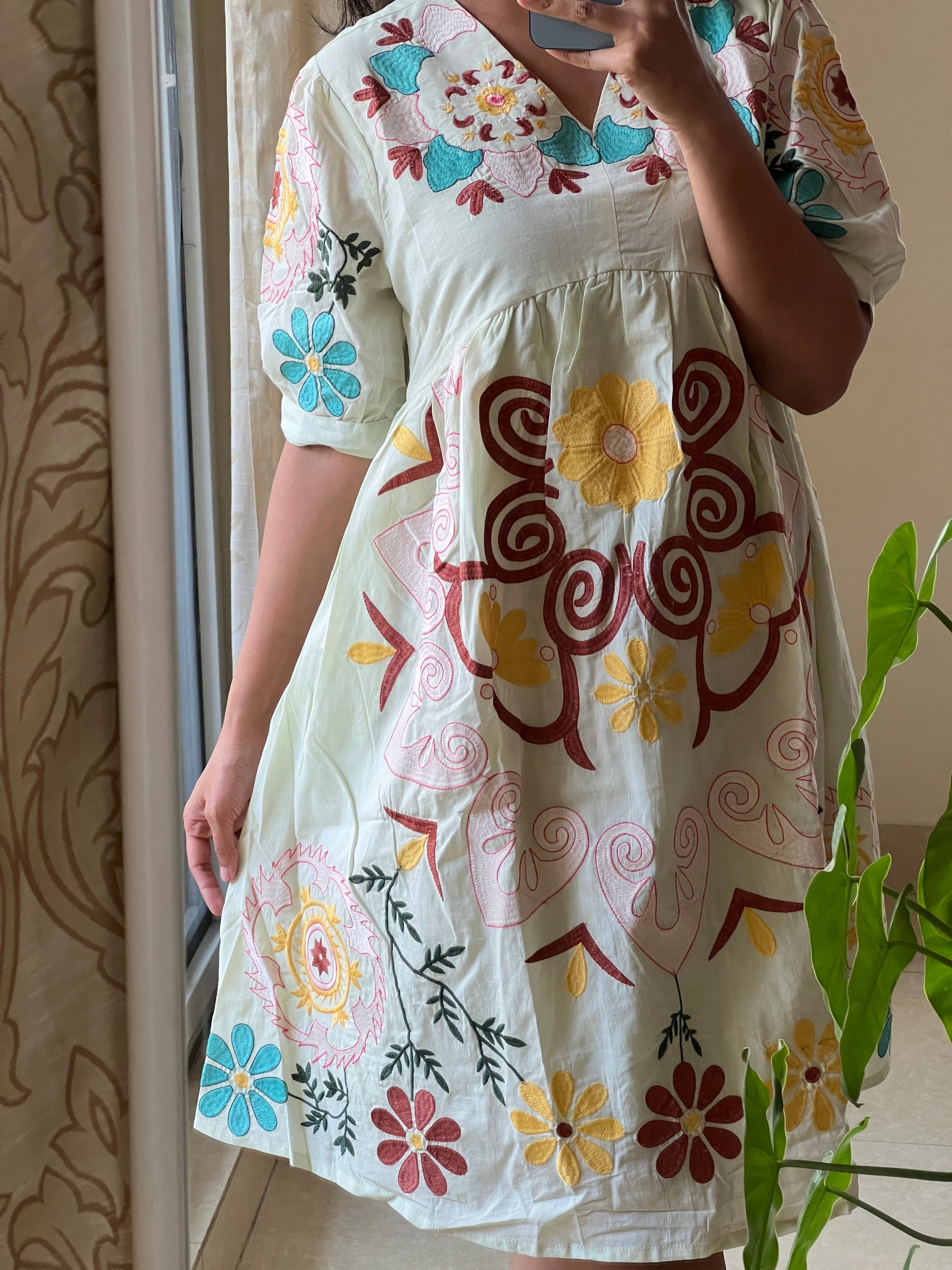 A0136 pure cotton pista green one piece short dress with machine embroidery