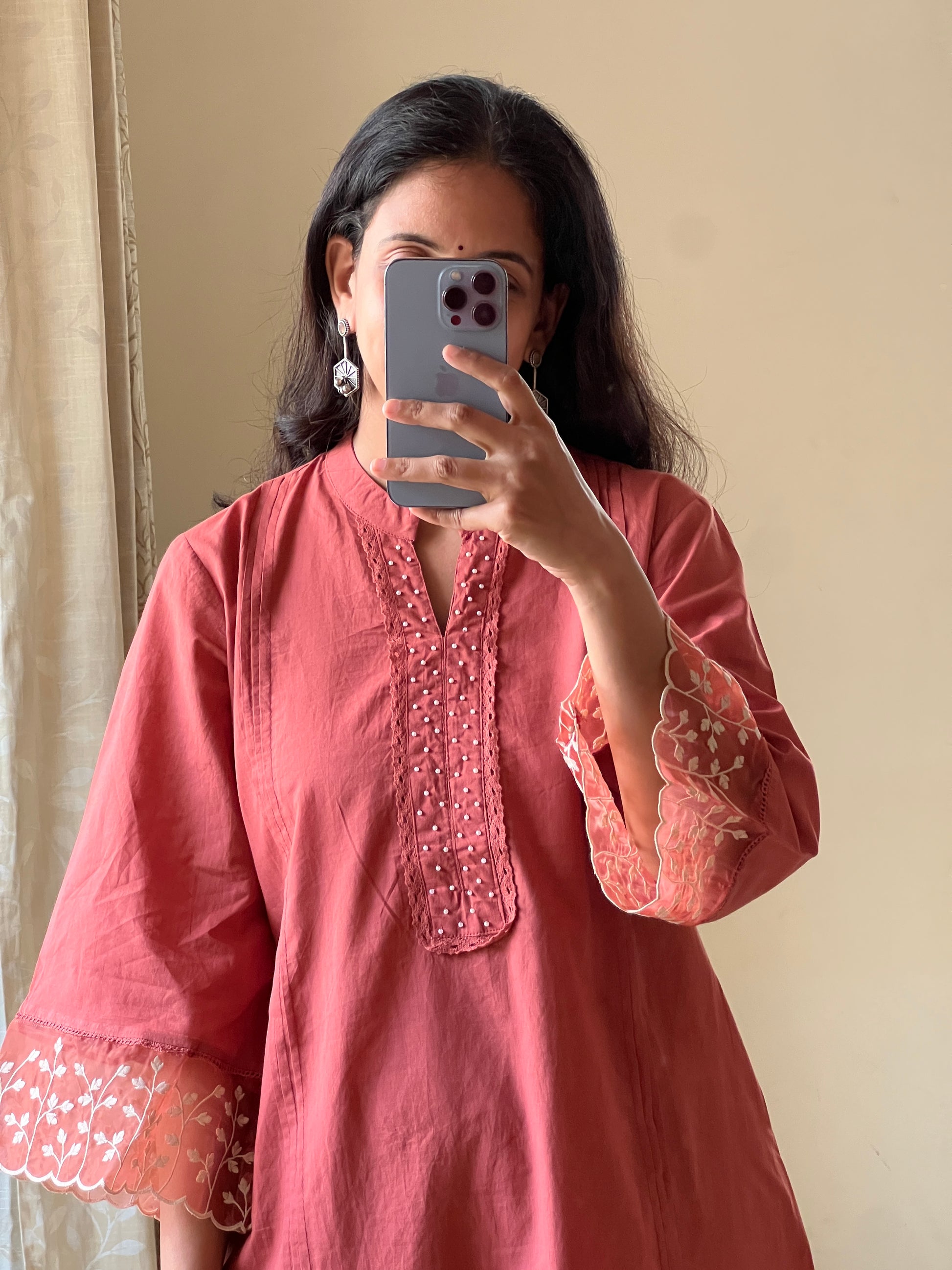 rust cotton 2 piece set with organza patch work detailing