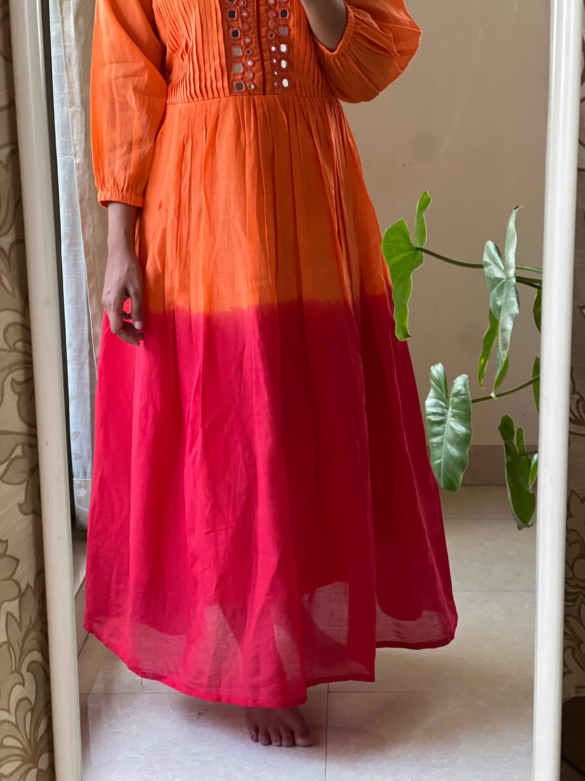 A0350 orange & red mulmul shaded one piece dress with mirror work embroidery & pleats detailing