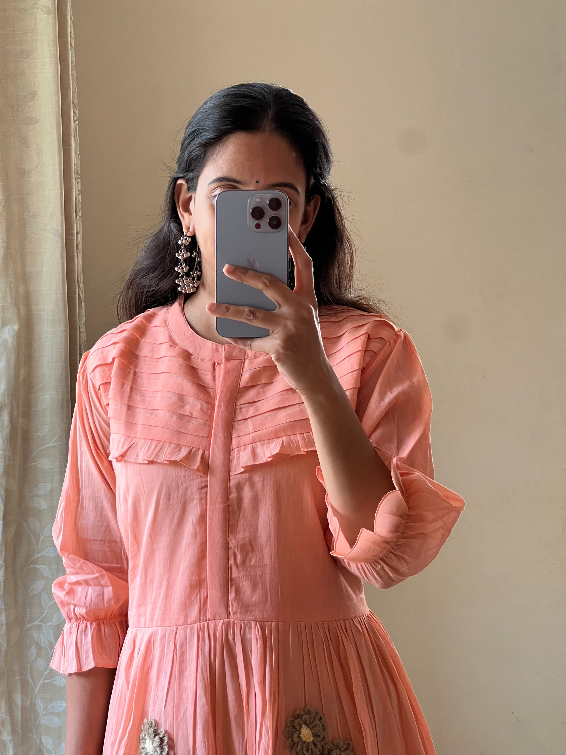 A0394 peach Mulmul one piece dress with jute thread work detailing
