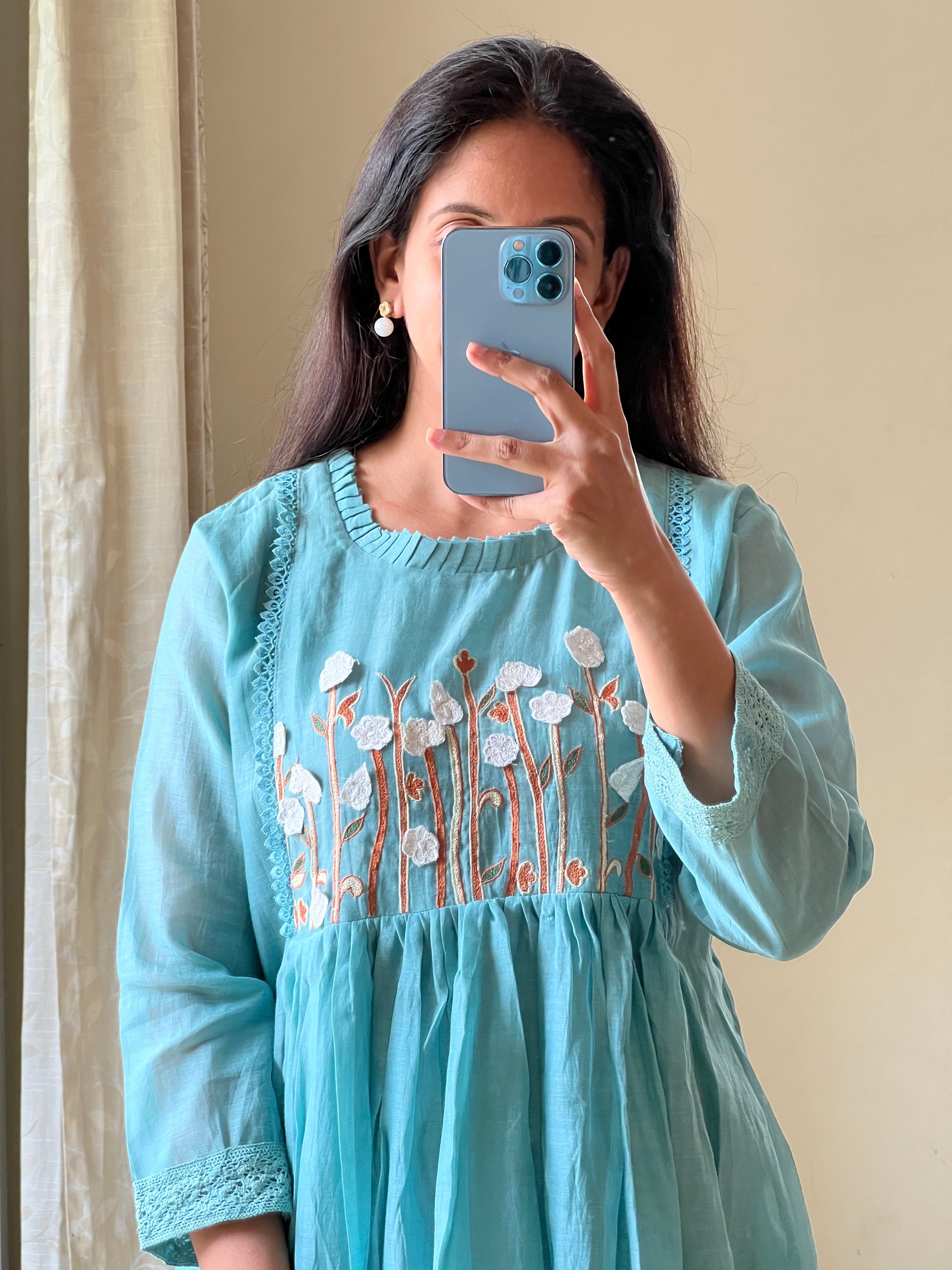 A0406 blue Mulchanderi one piece dress with applique and embroidery detailing