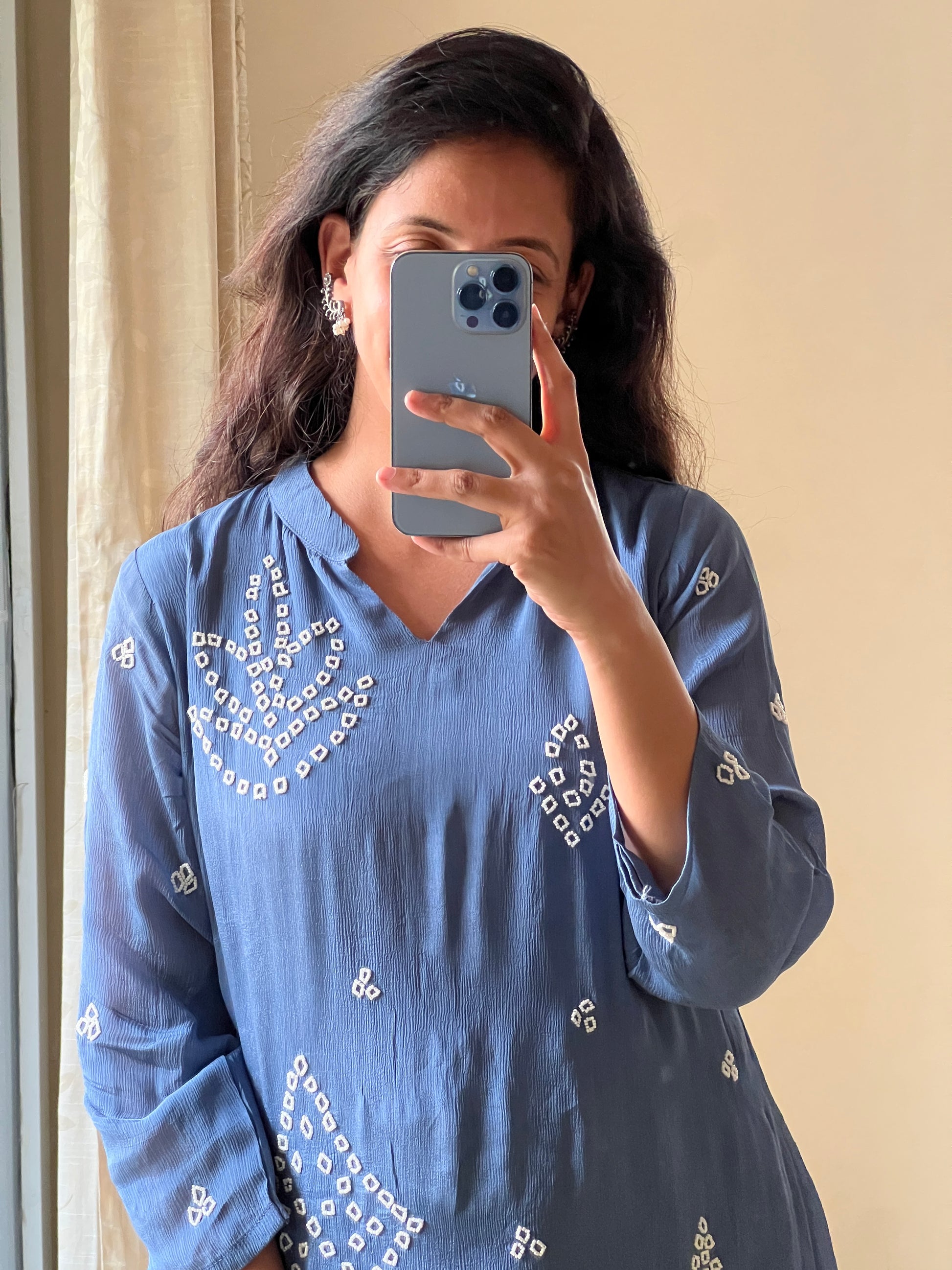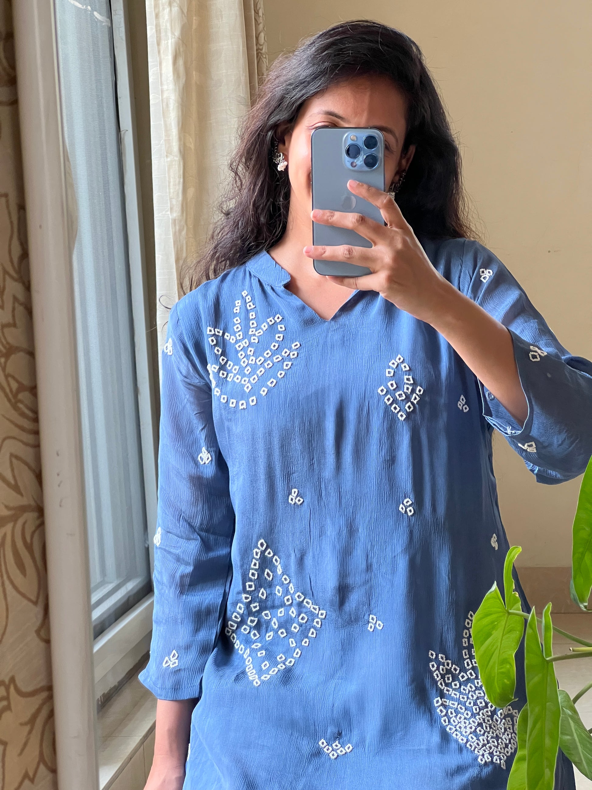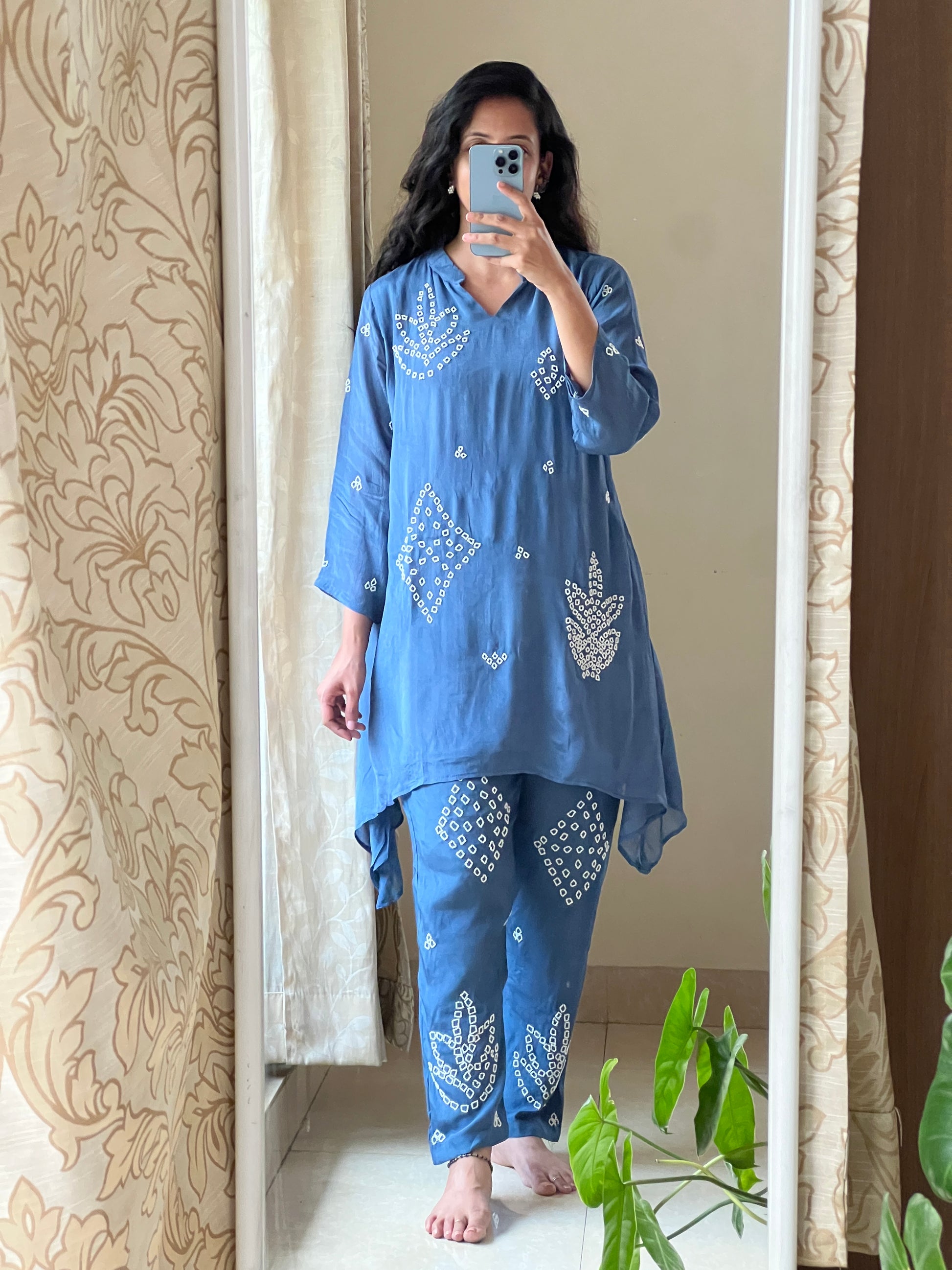 blue chinnon coord set with pearl embroidery detailing all over the dress and pants