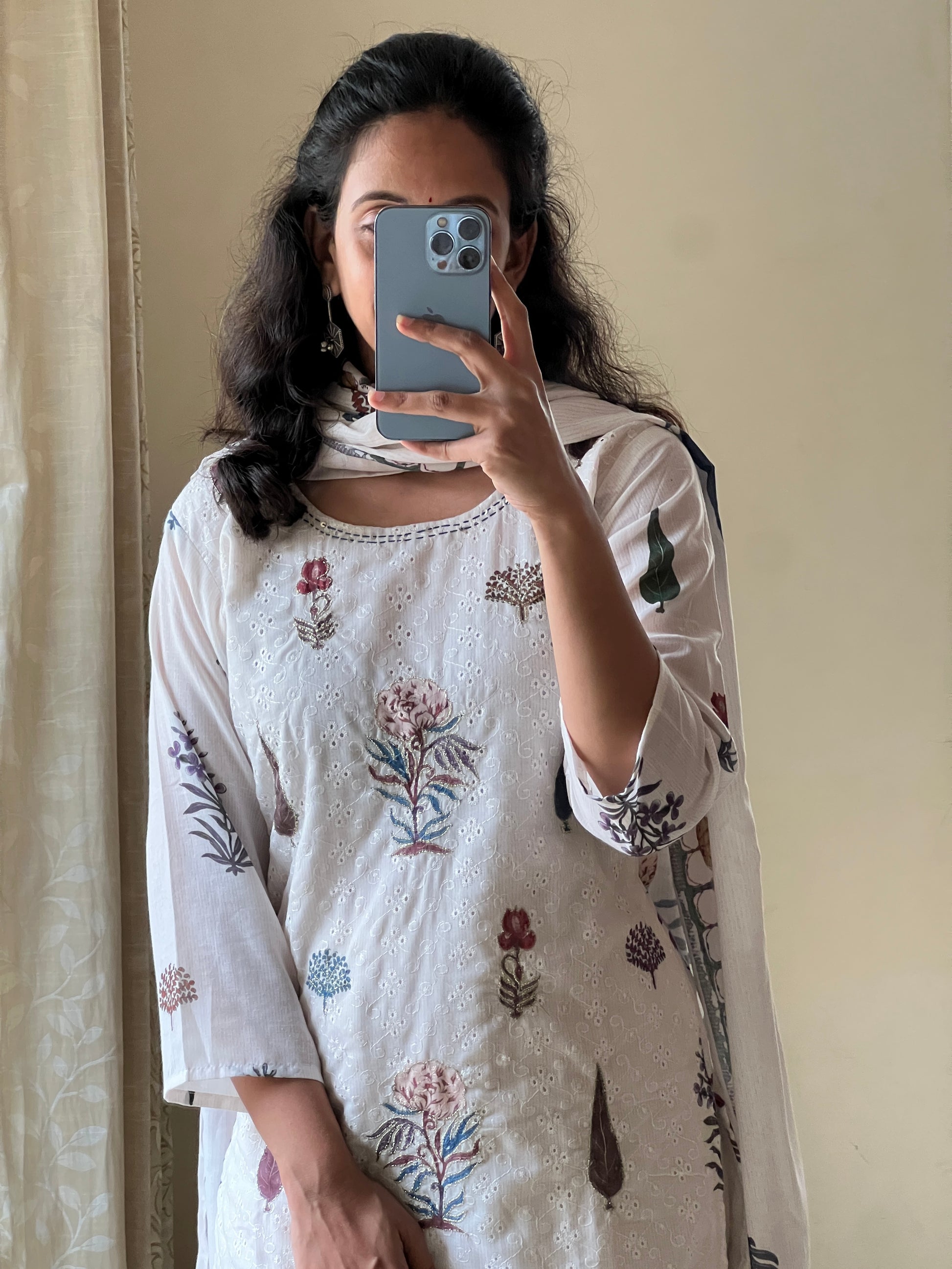 white pure cotton printed 3 piece set with embroidery detailing