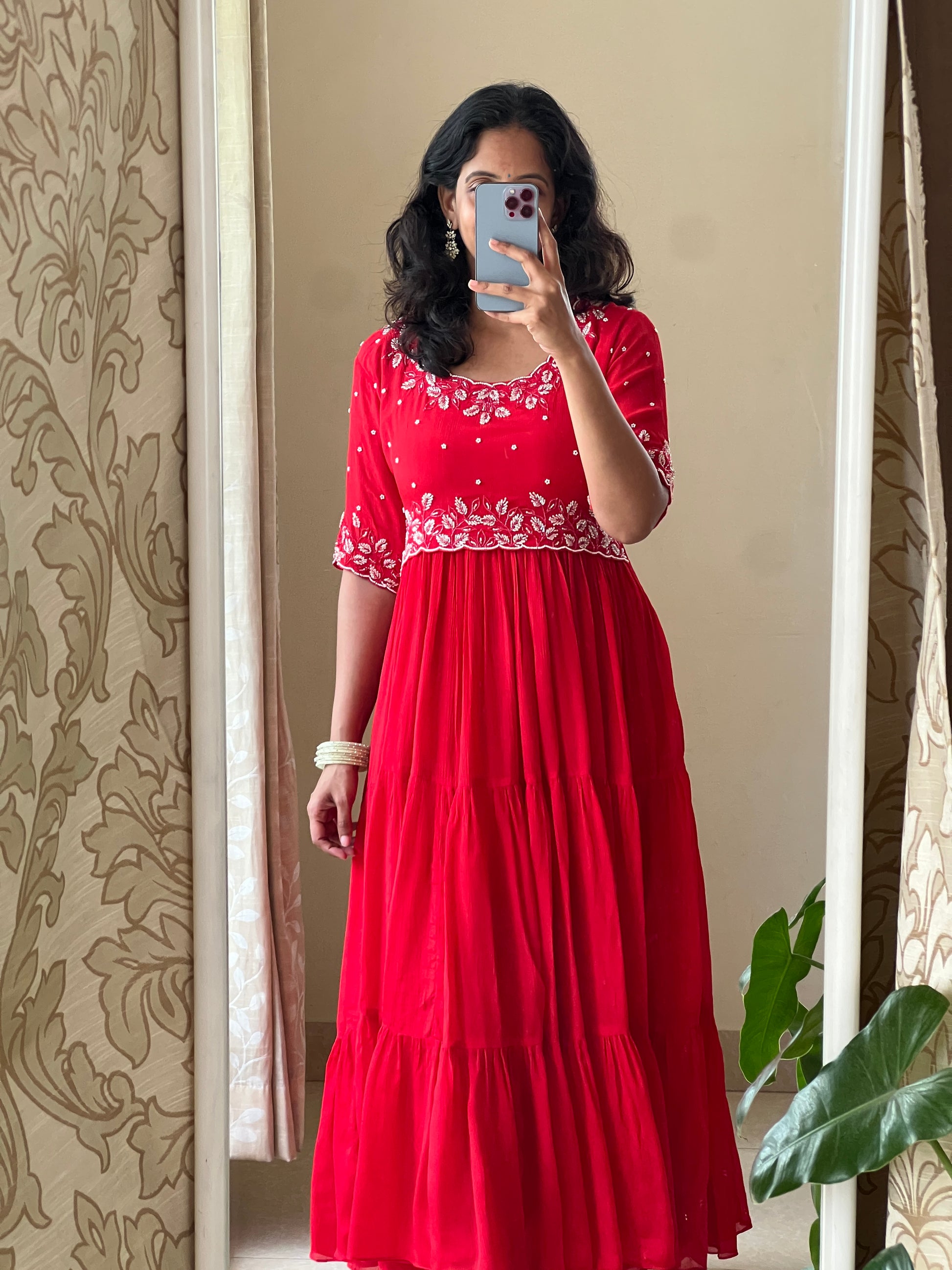 red chinnon one piece dress with moti & beads work