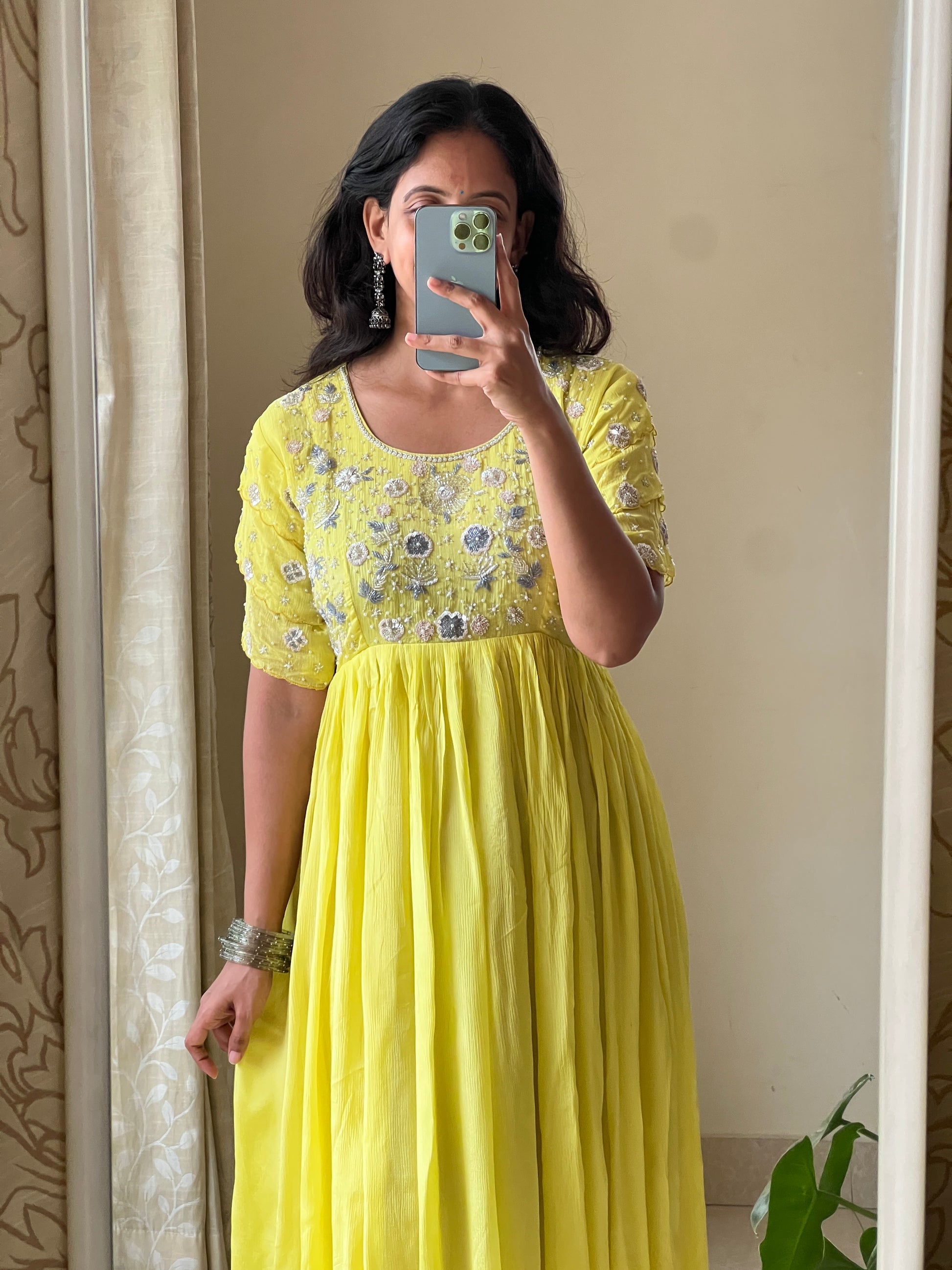 yellow chinnon one piece dress with beads, zardosi & chips embroidery