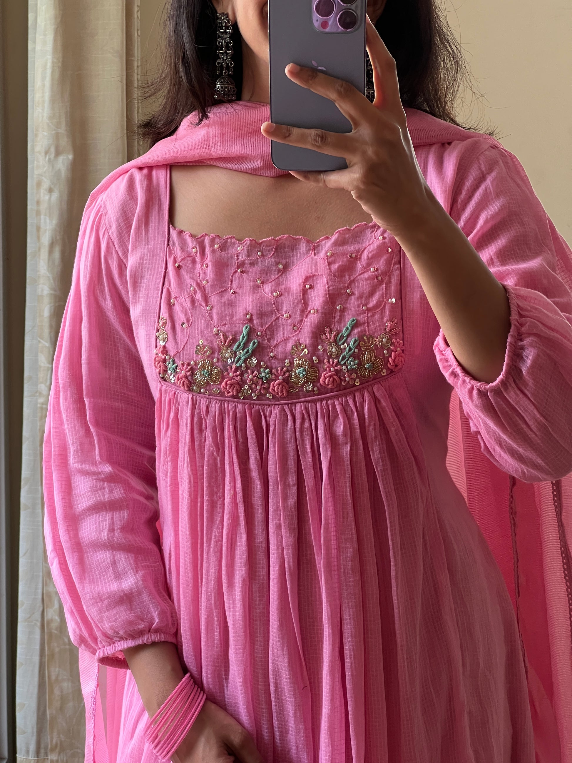 baby pink cotton kota 3 piece dress with hand embroidery detailing on yoke and butties all over dupatta