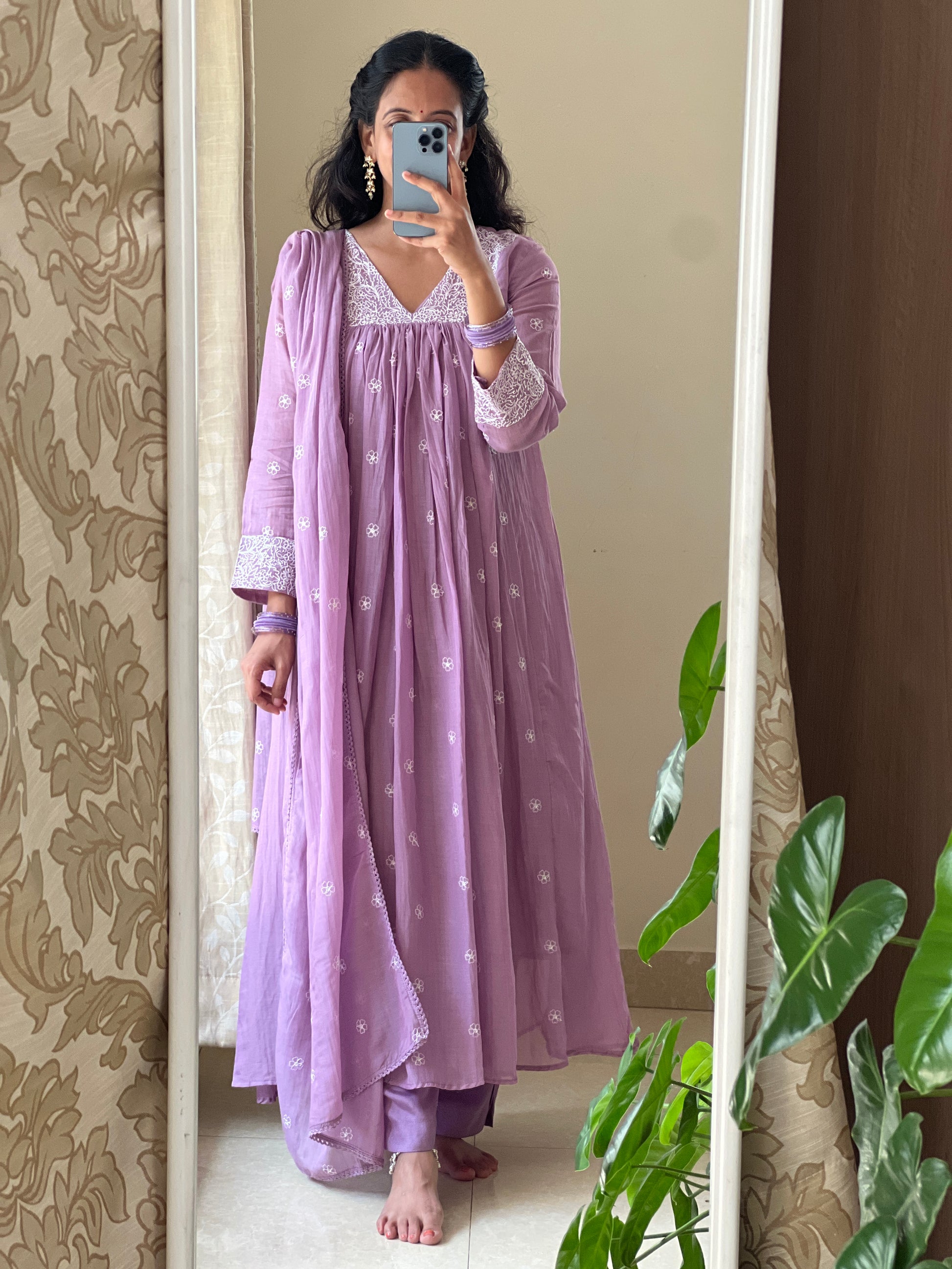 lavender mul chanderi 3 piece dress with embroidery detailing all over the dress