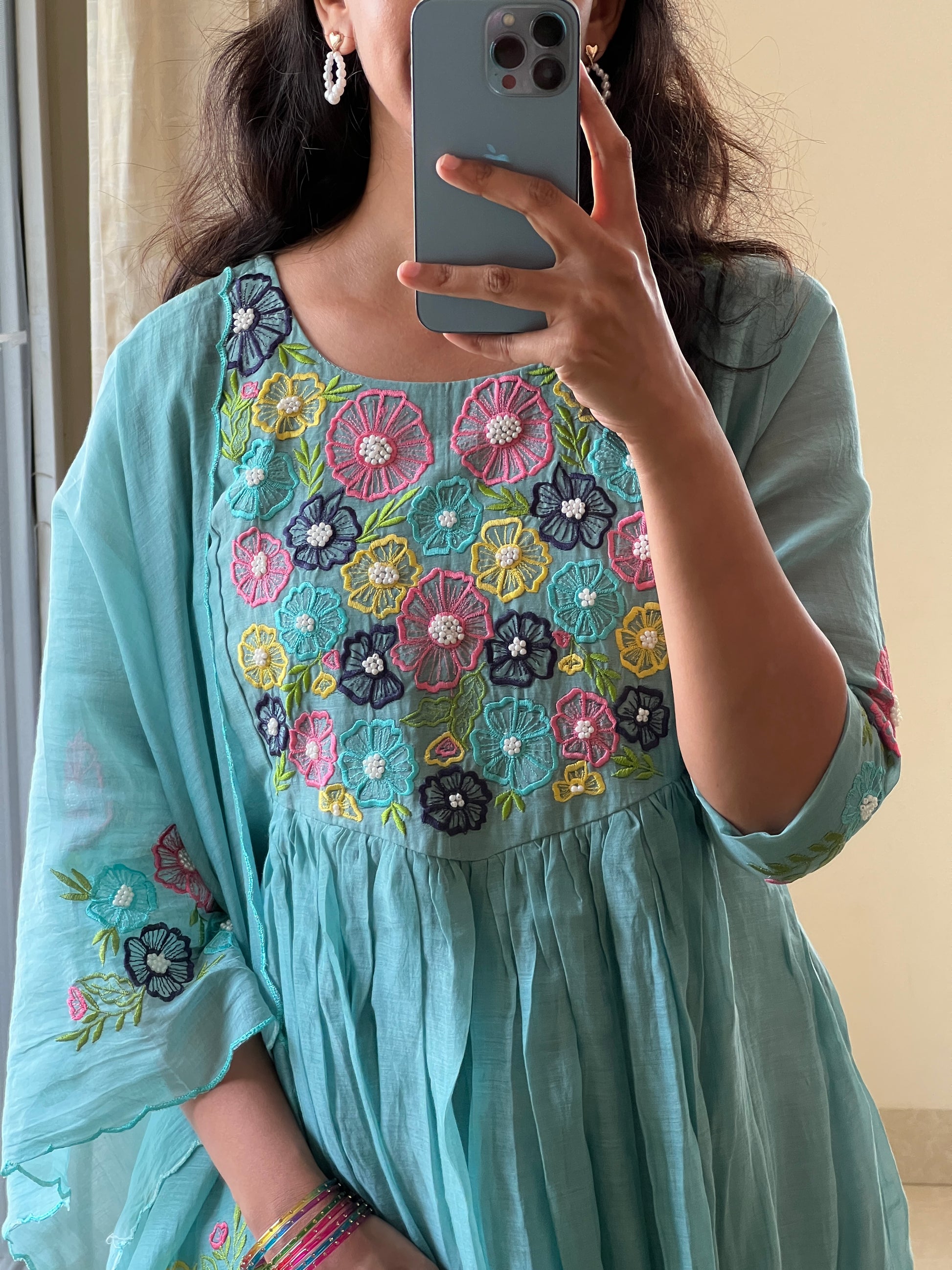 firozi blue mul chanderi 3 piece dress with multi colour threads floral embroidery all over the yoke & duppatta