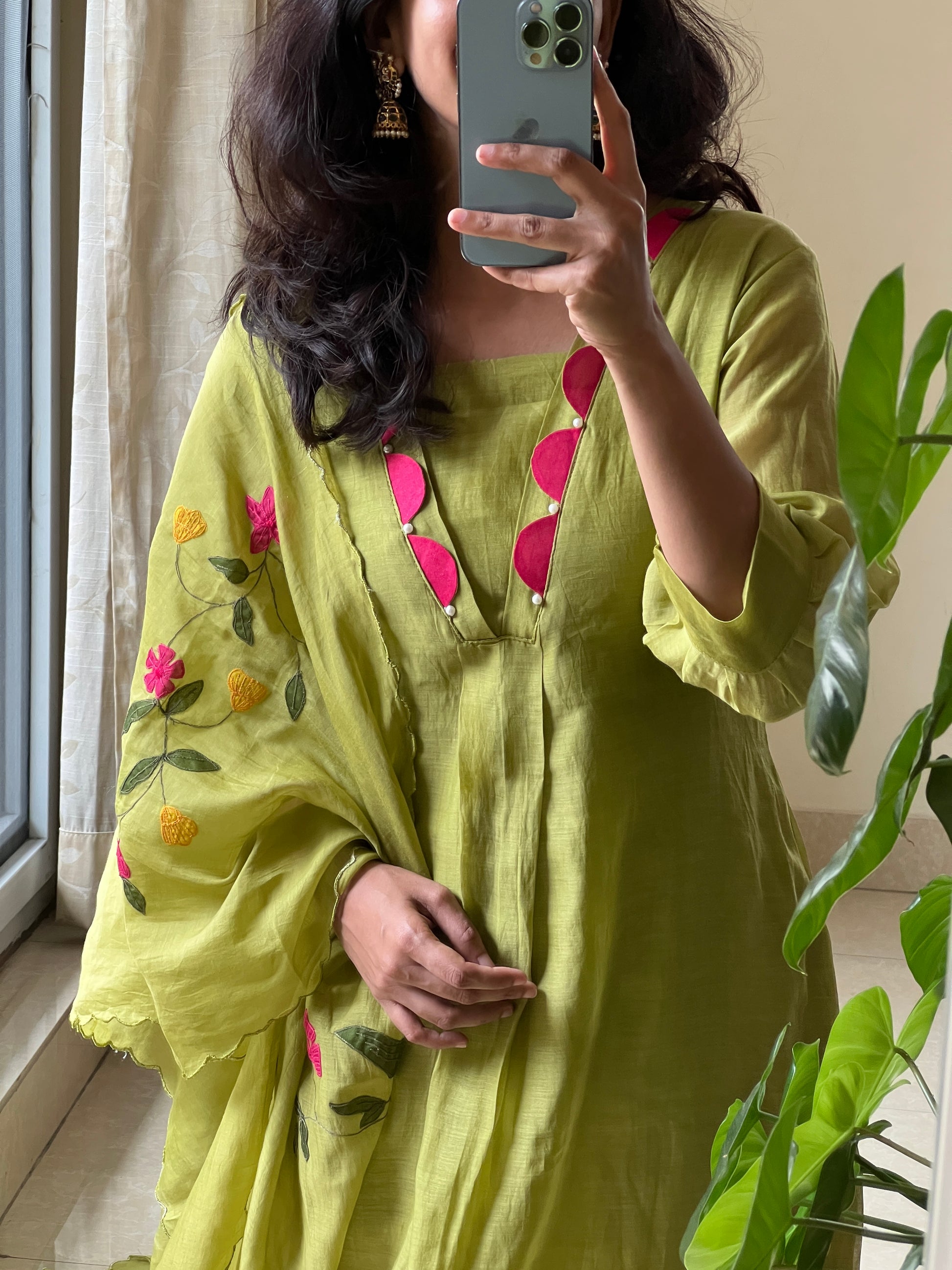 green Mulchanderi 3 piece dress with multi colour applique work detailing at the bottom of the dress
