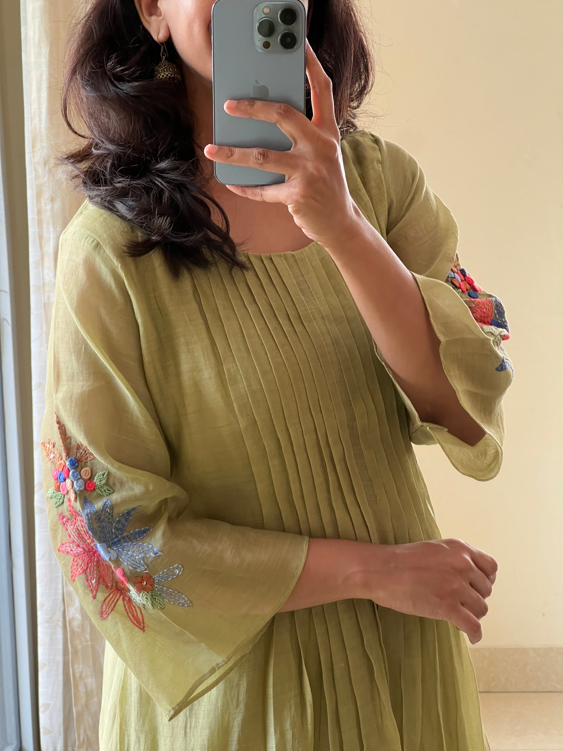 green mul chanderi coord set hand embroidery detailing at bottom & hands