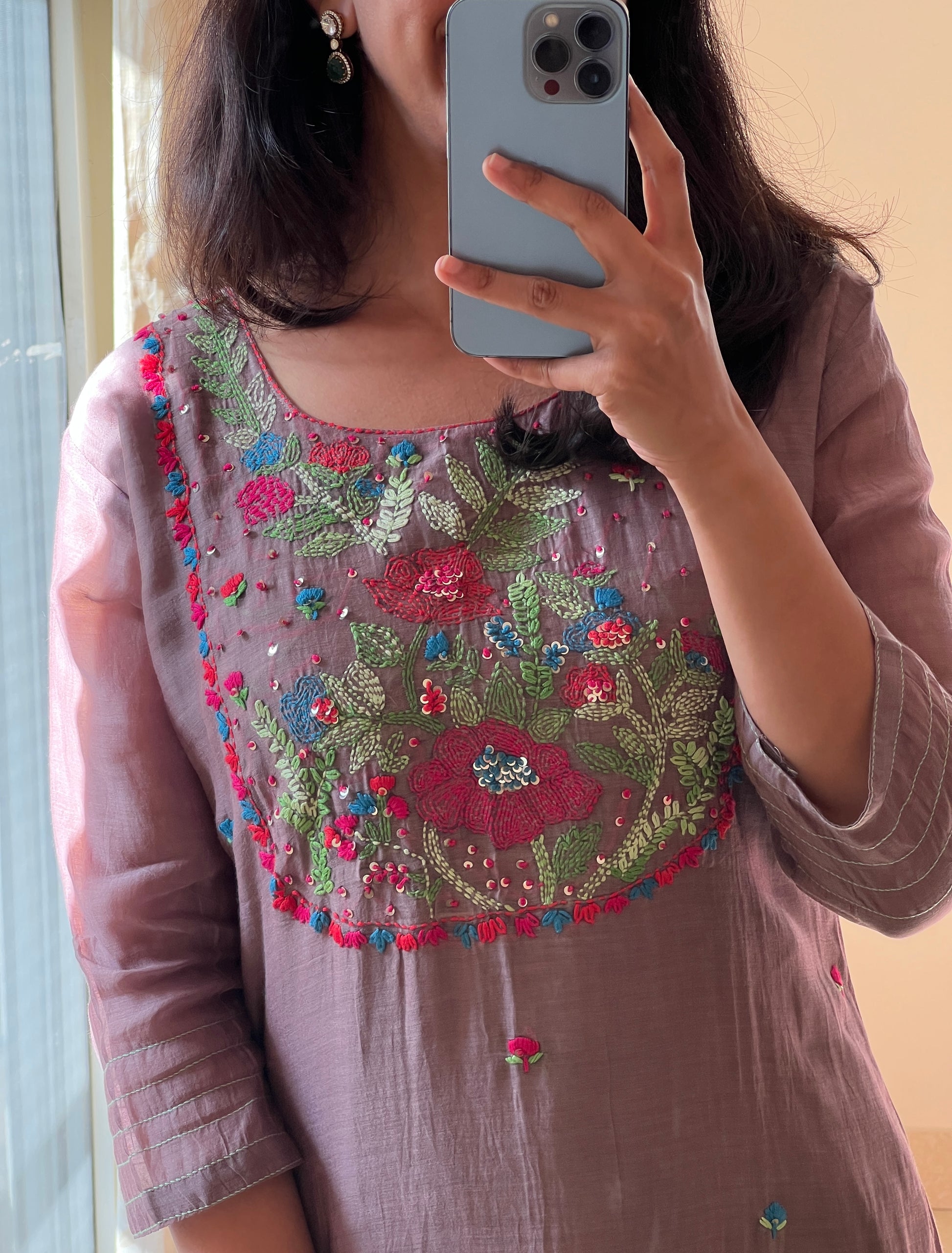 A0546 brown mul chanderi 2 piece dress with Kantha work detailing on yoke part & butties all over the dress