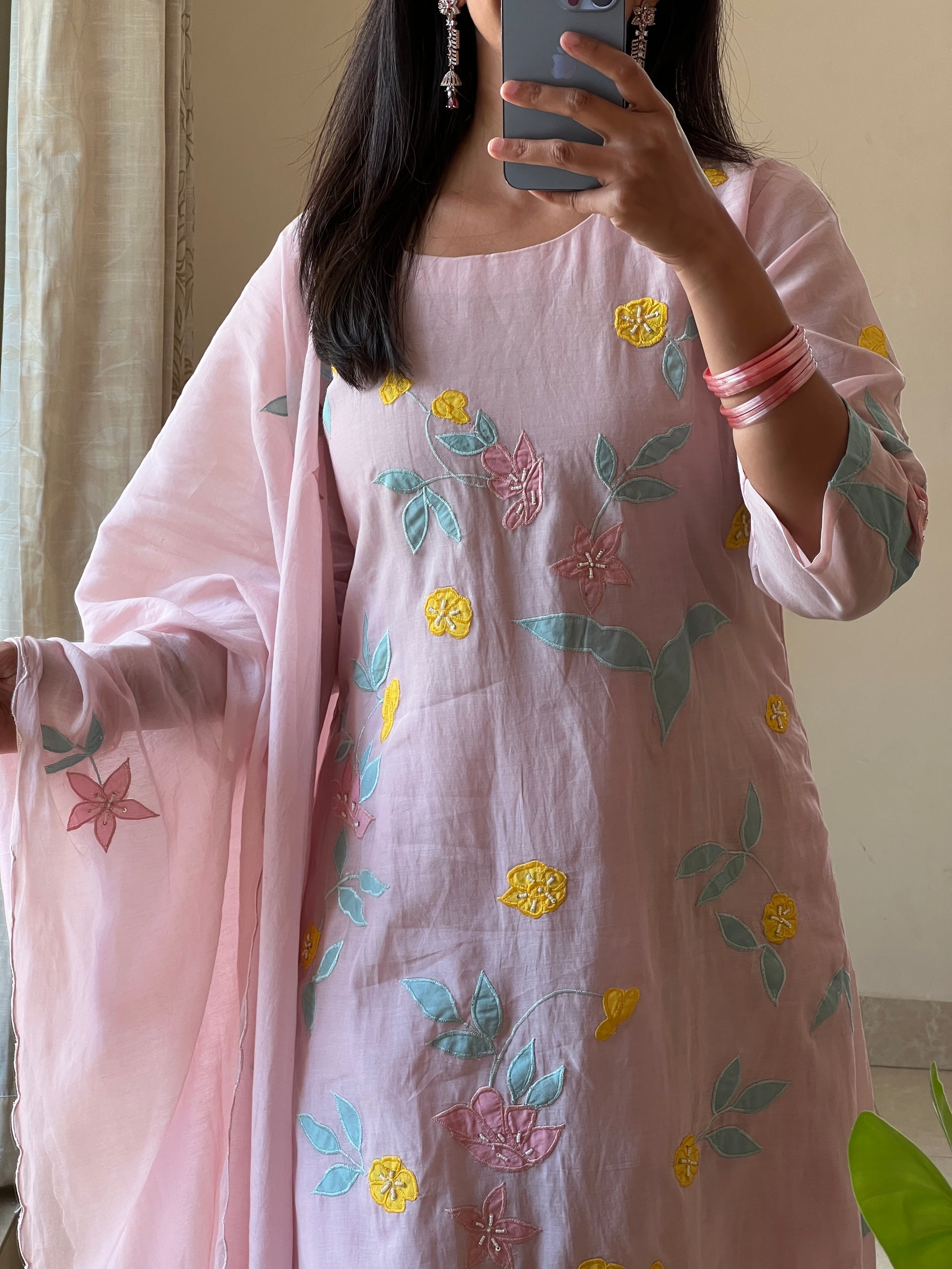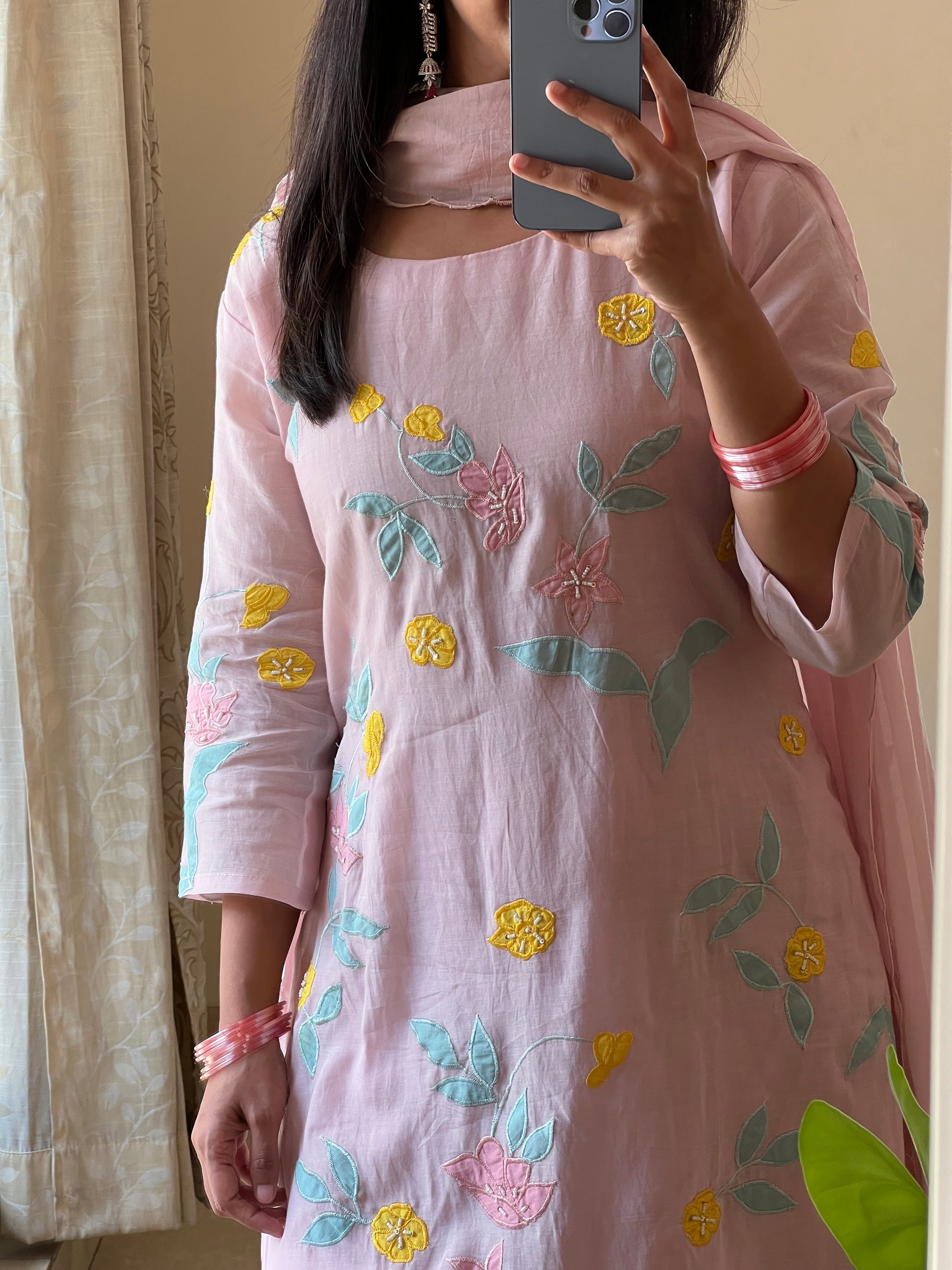 nude pink mul chanderi 3 piece dress with multi colour applique work detailing all over the dress & duppatta