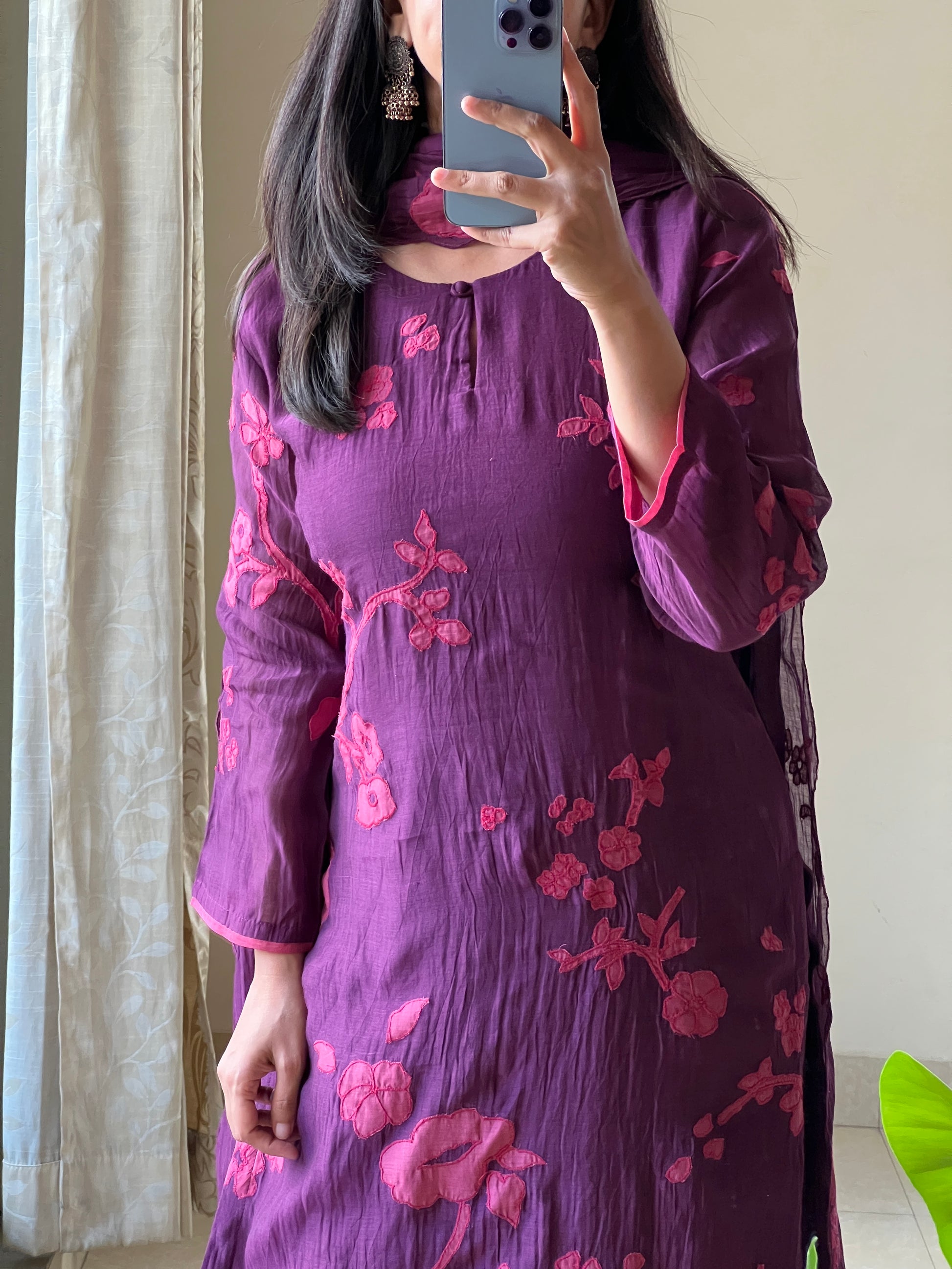 Purple mul chanderi 3 piece dress with applique embroidery detailing all over the dress & duppatta
