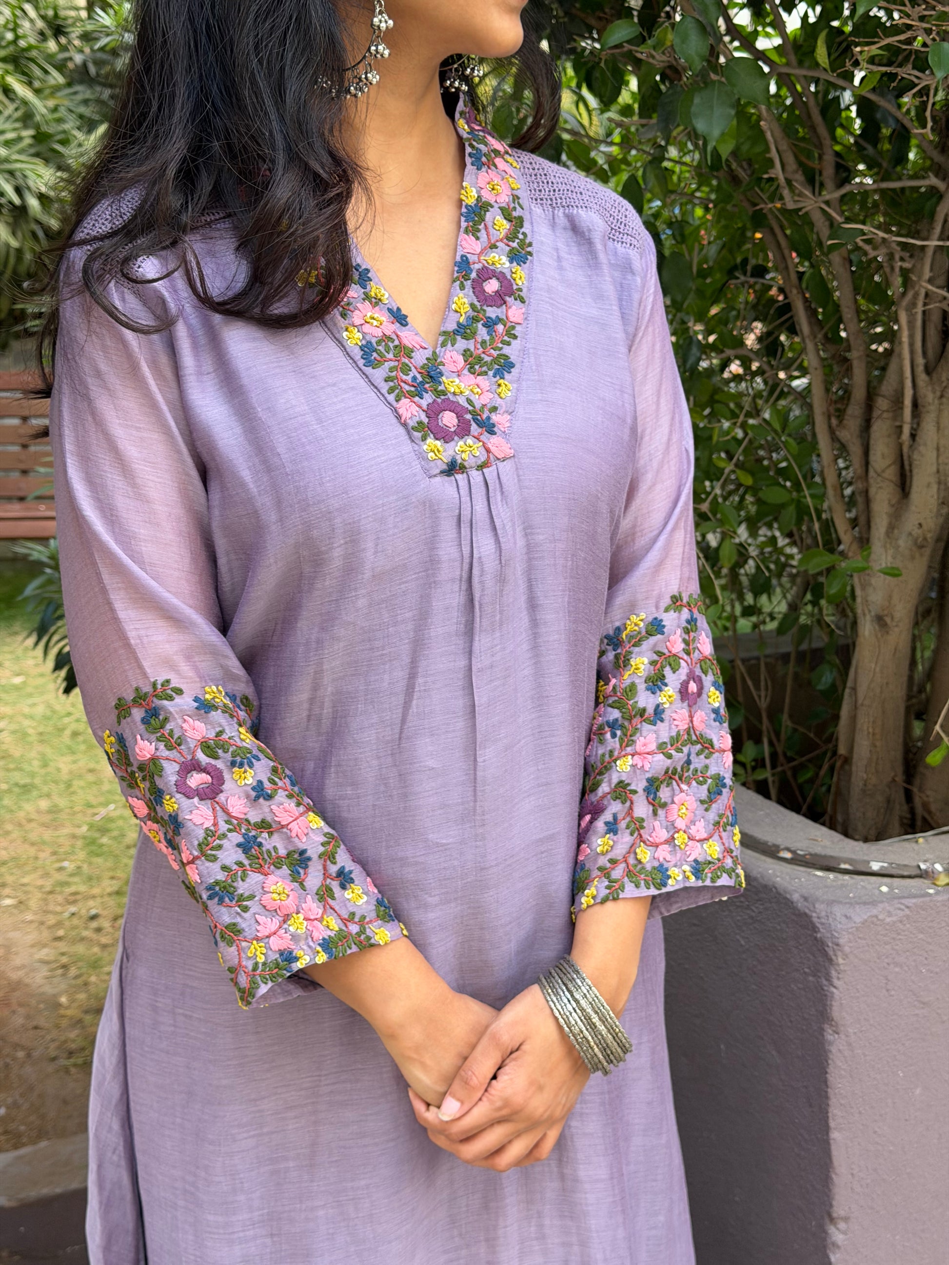 A0594 lavender mul chanderi coord set with lace & hand embroidery detailing